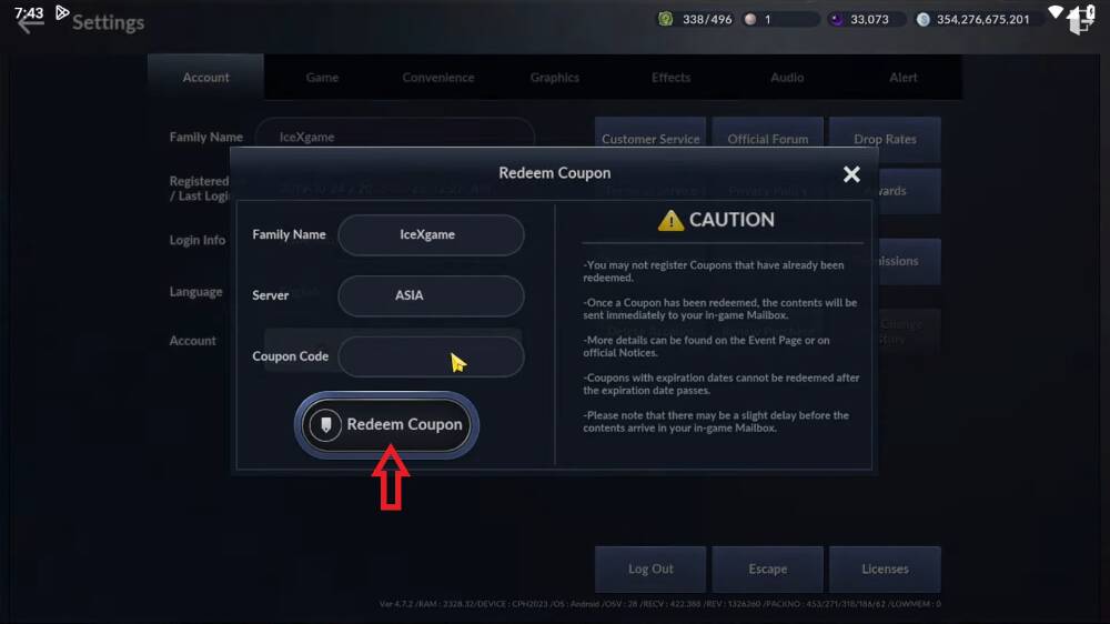 Bước 5: Hộp thoại mới xuất hiện. Nhập mã quà tặng trên vào ô Coupon Code. Sau đó bấm “Redeem Coupon” để nhận phần thưởng.